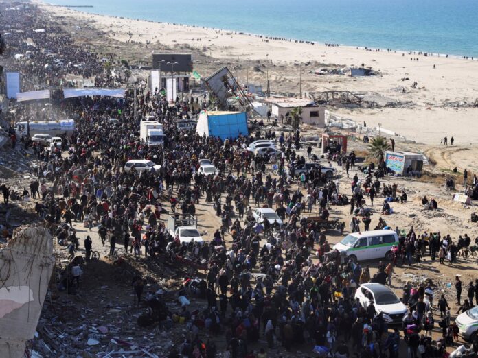 Una columna de decenas de miles de palestinos avanzaba cargados con sus enseres, a pie o en vehículos, para reunirse con sus familias, buscar a sus desaparecidos o intentar encontrar sus casas en calles arrasadas e irreconocibles.