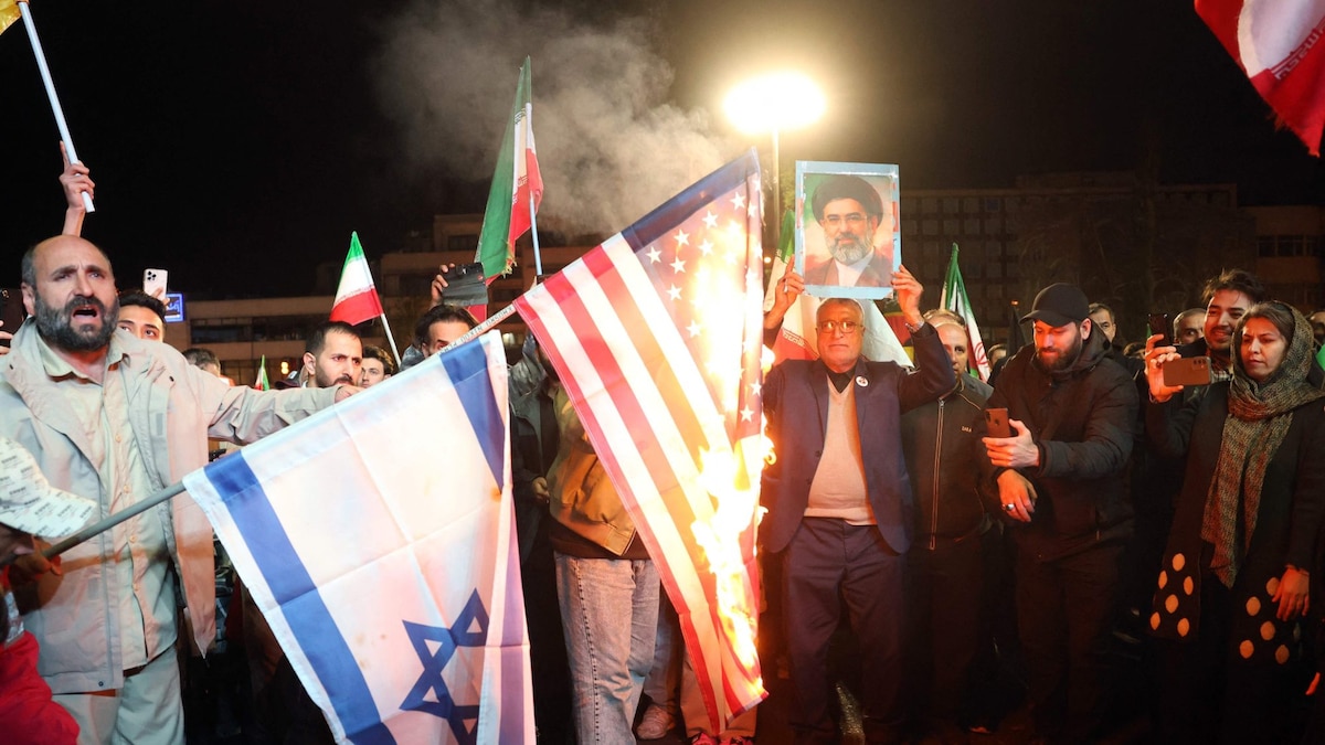 Iraníes queman banderas de Estados Unidos e Israel mientras reaccionan tras el anuncio del alto el fuego en la plaza Enqelab, en Teherán, el 8 de abril de 2026STR – AFP