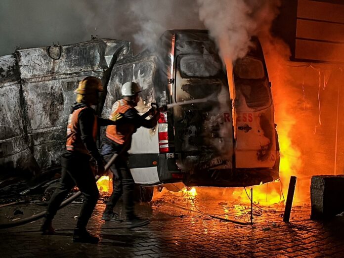 Una camioneta de prensa destruida por un ataque aéreo frente a un hospital en Nuseirat, en la Franja de Gaza. Foto: EFE   Una camioneta de prensa destruida por un ataque aéreo frente a un hospital en Nuseirat, en la Franja de Gaza. Foto: EFE