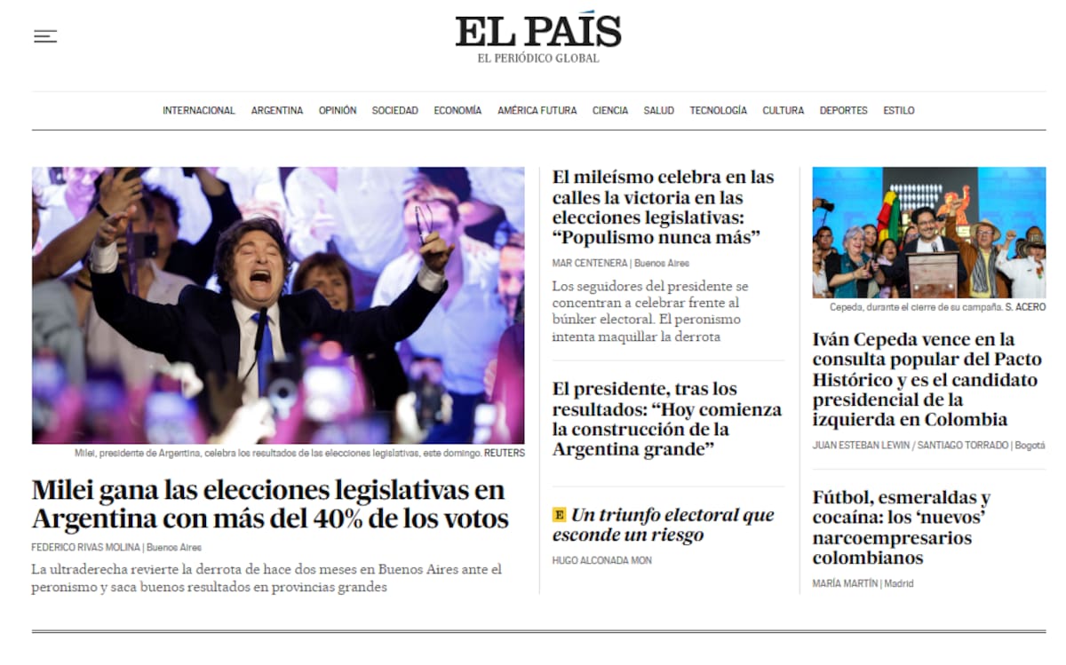 El diario El Mundo destacó la elección en su primera plana y la definió como un “triunfo claro” frente al peronismo. La publicación española señaló que el gobierno argentino atravesó “meses de turbulencias y malas noticias” y remarcó la sorpresa que generó la victoria de La Libertad Avanza en la provincia de Buenos Aires.