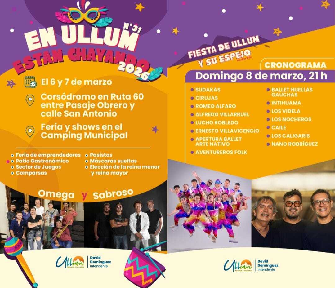 El domingo 8 de marzo se vivirá la gran “Fiesta de Ullum y su Espejo” en el Camping Municipal, con la presencia de emprendedores locales, patio gastronómico y sector de juegos para toda la familia. En el escenario mayor se presentarán Los Nocheros y Los Caligaris.