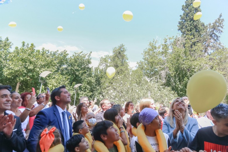 En el marco del Día Internacional de la Lucha contra el Cáncer Infantil, que se conmemorará el próximo 15 de febrero, el gobernador de San Juan, Marcelo Orrego, participó de la tradicional suelta de globos amarillos que cada año convoca a familias, pacientes, equipos de salud y organizaciones comprometidas con esta causa. Estuvo acompañado por autoridades de FundaMe, ministro de Salud, Amilcar Dobladez, y autoridades del hospital.