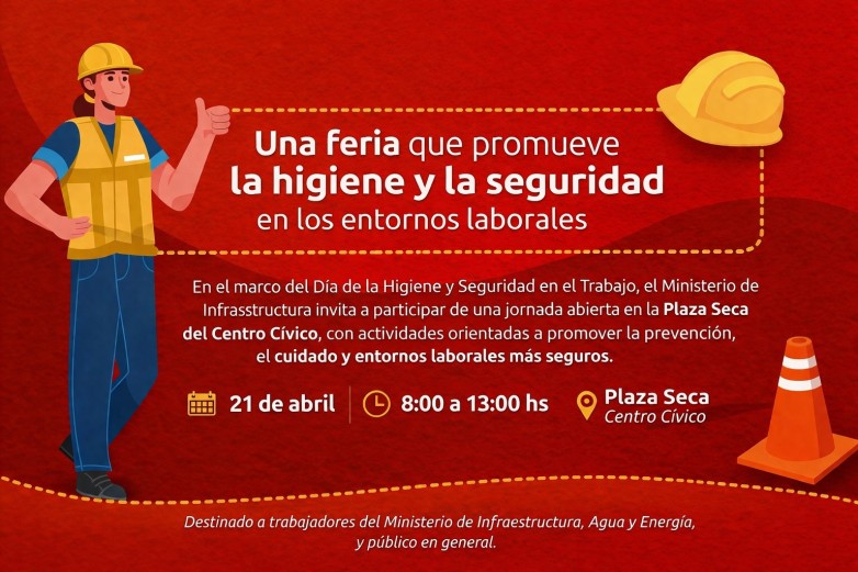 En el marco del Día de la Higiene y Seguridad en el Trabajo, el próximo 21 de abril se realizará la Feria de Higiene y Seguridad en la Plaza Seca del Centro Cívico, de 8 a 13. Esta propuesta busca fortalecer la cultura del cuidado y la prevención en los entornos laborales. Esta actividad es organizada por la Dirección de Gestión de Talento e Higiene y Seguridad, del Ministerio de Infraestructura, Agua y Energía.
